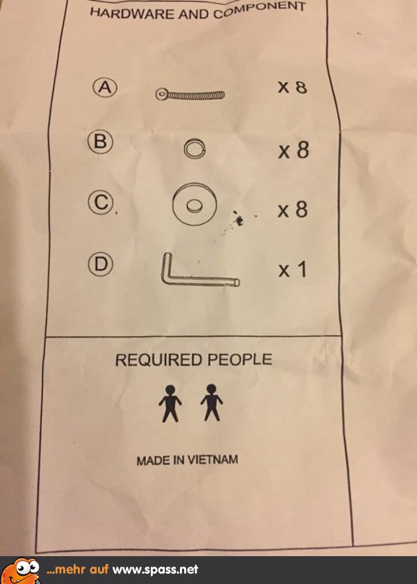 Spass.net » Lustige Bilder » Fail Aufbauanleitung Darf nur von zwei Vietnamesen aufgebaut werden… 32 7 Schreibe einen Kommentar Antwort abbrechenDeine E-Mail-Adresse wird nicht veröffentlicht. Erforderliche Felder sind mit * markiertKommentar * Name * E-Mail-Adresse * Website Name, E-Mail-Adresse und Website in diesem Browser für meinen nächsten Kommentar speichern. Δ