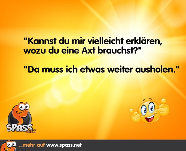Spass.net » Lustige Bilder » Sprüche Die Sache mit der Axt 15 0 Schreibe einen Kommentar Antwort abbrechenDeine E-Mail-Adresse wird nicht veröffentlicht. Erforderliche Felder sind mit * markiertKommentar * Name * E-Mail-Adresse * Website Meinen Namen, meine E-Mail-Adresse und meine Website in diesem Browser für die nächste Kommentierung speichern. Δ