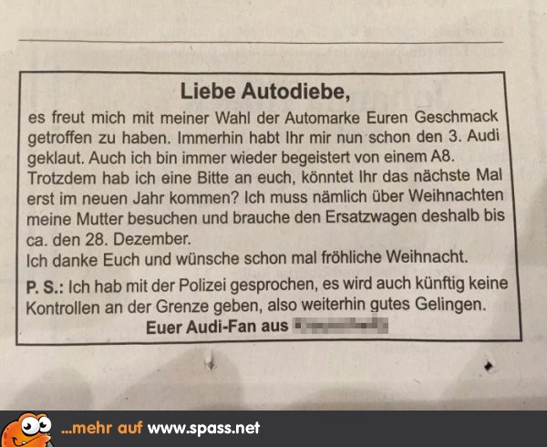 Spass.net » Lustige Bilder » Anzeigen Liebe Autodiebe… 48 10 Schreibe einen Kommentar Antwort abbrechenDeine E-Mail-Adresse wird nicht veröffentlicht. Erforderliche Felder sind mit * markiertKommentar * Name * E-Mail-Adresse * Website Meinen Namen, meine E-Mail-Adresse und meine Website in diesem Browser für die nächste Kommentierung speichern. Δ